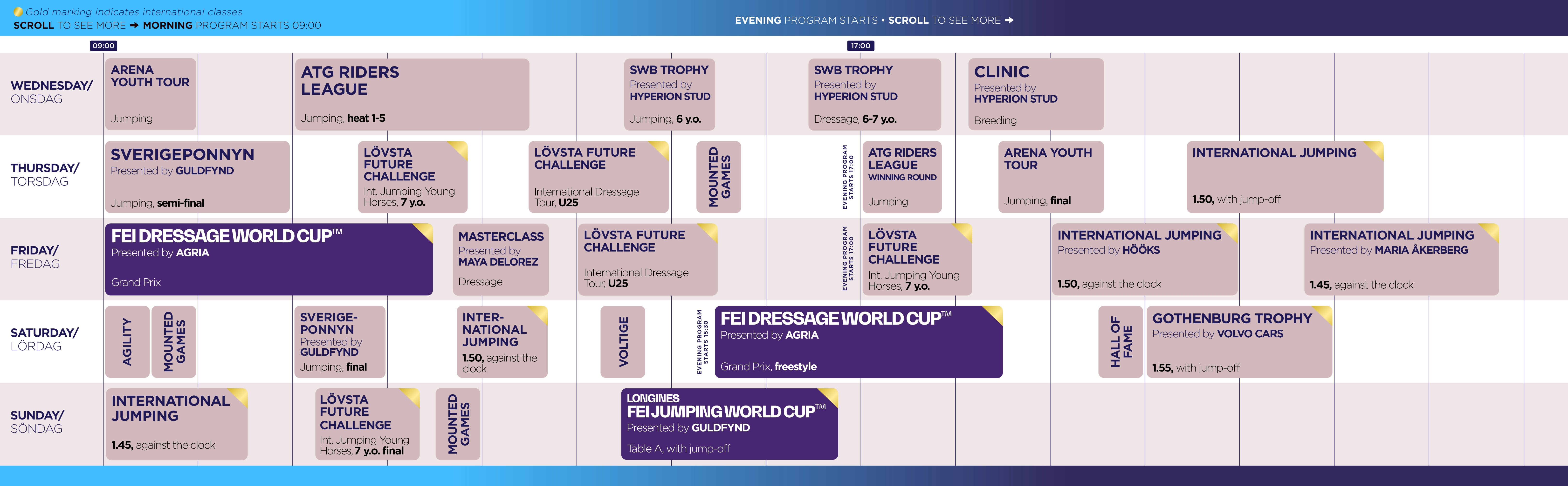 Den 18–22 februari 2026 är Gothenburg Horse Show tillbaka i Scandinavium. Nedan hittar du det fullständiga programmet, följt av mer detaljerad information för varje enskild dag.